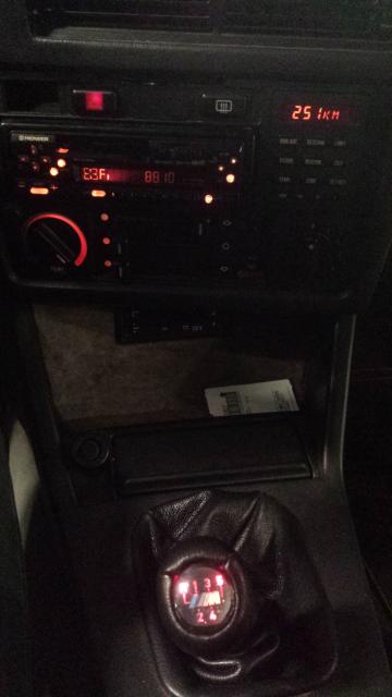 Vahepeal sai niipalju tehtud, et keldrist välja otsitud kunagi ühest varasemat rullikast üle jäänud m-tech valgustusega käigukangi nupp.Kuna nahk oli nupul aga üsnagi väsinud, siis esimesena sai seatud sammud nahameistri juurde.Päevake hiljem sain juba nupu kätte ja kvaliteediga võis küllaltki rahule jääda. Asusin siis nuppu paigaldama, kuid mis enam ei toimi on valgustus- eks selle nahatamistöö käigus olid nad vigastanud dioode.Kiire kontroll ja tuligi välja,et trükiplaadil- olevast 3-st dioodist 2 enam koostööd ei teinud.Õnneks aitas oomipood hädast välja ja päev hiljem on tulemus selline: Siiski tuleb tõdeda, et hetkel pole veel päris rahul- kuna see käigunumbritega osa on veits väsinud,siis katsun seda kas värskendada või kuskilt korralikuma leida.