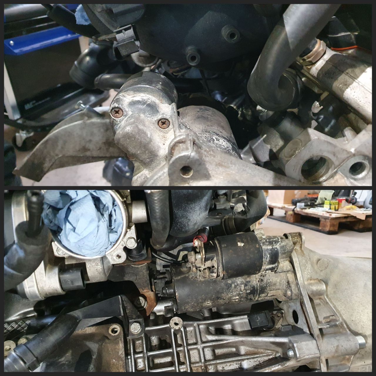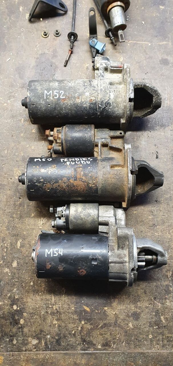 2/3 Startereid Siis tuli järgmine garaazi päev, kus sai startereid lahatud. Üks hää mees oli nõus mulle M50 starteri loovutama ning igaks petteks sebisin veel väidetavalt M52 küljest tulnud starteri ka juurde. Mõõtmetelt ja sisult tunduvad põhimõtteliselt identsed. Kinnitasin, et ka füüsiliselt M54 külge sobiks - sobiski. M50/52 starter Starter sobib ja varsti valmis Pildil ka näha miks M54 starterile sobivat pendiksit panna ei saa - võll kui ka nuut peenem. Kahjuks ei ole M50/52 kinnitusavad keermestatud, mis tähendab, et peab poldid mutriga lukustama. M50/52(all) vs M54(üleval) M20 hookaga on ainuke miinus, et seda ei saa tihvtiga lukku panna.