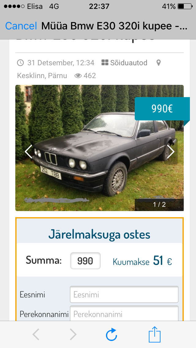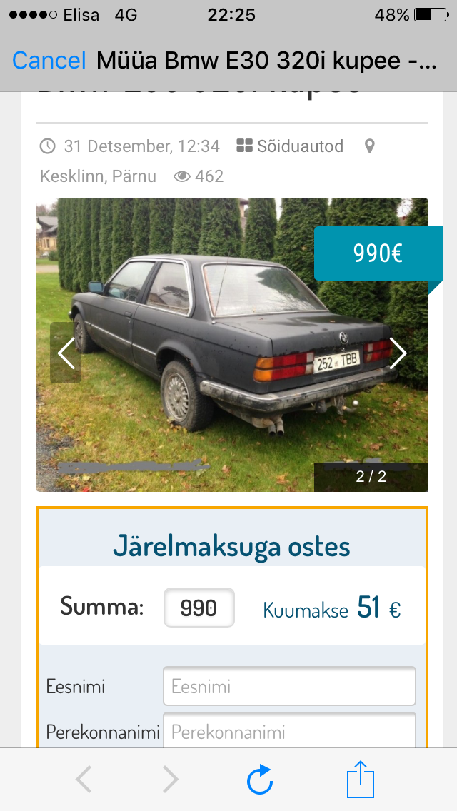 Tere kōigile e30 huvilistele. Sai soetatud mōned päevad tagasi üks korralik roostehunnik ja plaan see korda teha. Mootoriks 2.0 92kw kere originaalis kuldne keegi asjamees kuskil vabas ōhus vōi lasna garages natuke vaeva näinud ja mustaks vōōbanud mōned aastad tagasi. Proovin järjest siia pilte lisada. Esimene etapp on sisu puhtaks teha ja pōhi korda teha. Igasugune ajalugu autost on teretulnud.