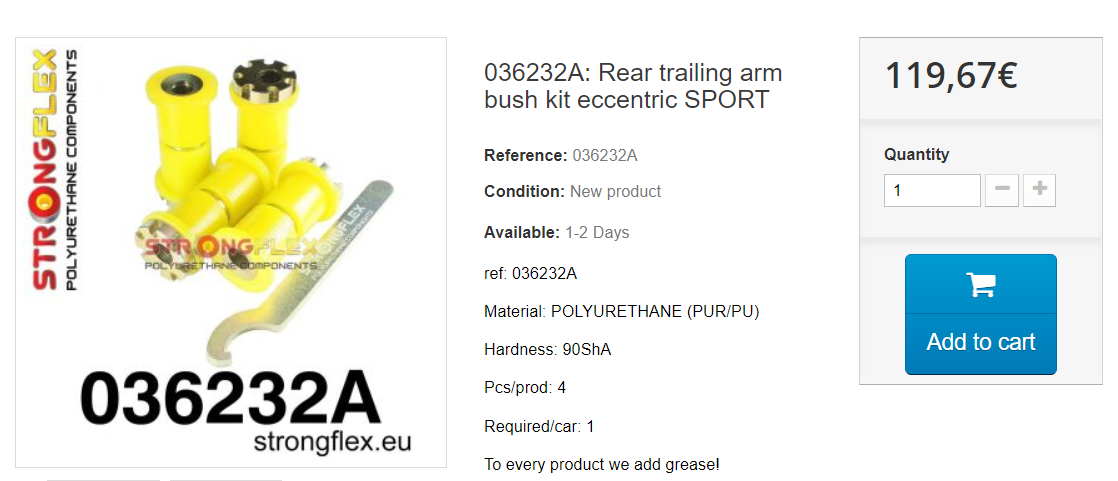 Juhi nurgast kaotasin ära selle tehase "tõstekoha", samas logarikinnitust ei pidanud ka vajalikuks sinna jätta. Alumise kinnituse kohal kohe teine kinnitus ja samas hoiab tiib ka teda paigal. Tagapõll sai siis 5 kihti roostekrunti ja umbes täpselt 6 kihti kivikaitset. Vaja nüüd ainult kivikaitse ära värvida. Tellisin veel ta-technix madaldusringi ära (60/40), eks ole näha kuidas istuma hakkab. Päris kindlalt on flantsi ka vahele vaja. Kuna tagasillapuksid, diffripuks ja esimesed õõtsapuksid on juba polu, siis tellisin stabikavarrastele ja kontidele strongflexid, peaks veits konkreetsem olema küll. Üks huvitav leid hakkas silma Strongflexi kodulehel kolades. E30 tagumised eksentrik õõtsapuksid, alternatiiv sillatala keevitamisele. Saab veits lihtsama nipiga tagumise camberi normaalsemaks. Hind isegi okei, kui hakata võrdlema sillatala camberplatede ja eksentrik poltide hinnaga Keegi julge võiks ära proovida.