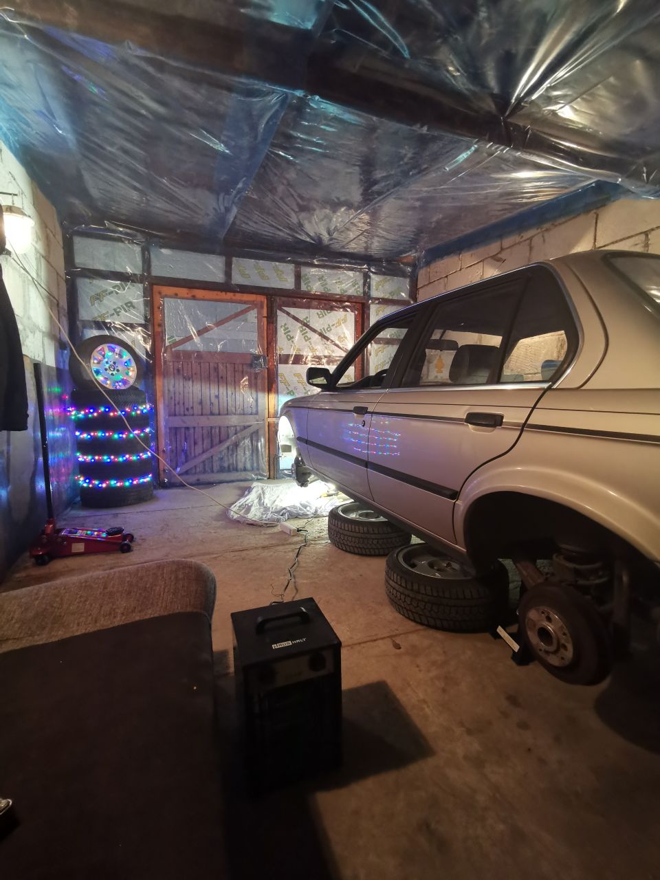 Nii, Eestis tagasi, rulla garaažis ja sai ka vähe jõulumeeleolu loodud 😀 (Varjud moonutavad neid tulesid 😀) Lubasin ka sisust pilte, valgus küll polnud kõige etem, aga vast pole hullu. Sees on Hartge rool ja käigukanginupp. Nahad pole küll kõige värskemad, aga veel terved. Mingi Sony makk, millel auxi võimalus - väga viis. Praegu ainult makile papijupid vist ümberringi pandud, et tihkelt sees oleks. Äärtest paistab välja nagu ka pildilt veits näha. Ei tea äkki saab sinna mingi raami ümber, et vähe viisakam jääks? Istmed on tumepruunist nahast. Juhiistmel üks väike koht paigatud ja ukse pool ääres veel ühest kohast veits katki. Samuti juhi istme seljatoe tagumine plate lahti hetkel. Ja uksepolstrid on veits heledam pruun nahk. Ei ole tehasest tulevate variantidega nii hästi kursis ehk ei tea kas nii peabki olema (kahtlane) või on miskit vahetatud. Muidu minu silma pole häirinud, pildi pealt tundub värvivahe palju suurem. Taga on kardin, mis omal jõul ennast kokku kerida muidugi ei tahtnud. Aga ei häirinud see praegu ja ilmselt ei häiri lähitulevikus ka mitte. Hertz kõlarid aknalaual, heli väga viisakas ja hetkel minu jaoks täiesti piisav. Kõlarikatted kruvisin külge tagasi, kuna eelmisel omanikul olid lapsed pidevalt küüned taha ajanud sinna. Kapotialusest väike klõps. Kundepoolne küljepeegli klaas ämblik. Veel mõned jäädvustused. Sai ka kogemata Marguse juurde aeg ära bronnitud, löögile saab umbes 2021 oktoobris. Mõistus ei luba autoga midagi muud väga peale hakata enne kui roostest puhas. 😀 Värvivalik on veel väga lahtine, aga õnneks on aega mõelda veel. Peast on läbi käinud must, aga see nagu liialt tavaline. Tahaks veidi hallist massist erineda, aga mitte ka mingi meeletu neoontooniga. Samuti on hakkanud praegune värv meeldima. Ei tea. Eks näib. Marguse juurde läheb veereva kerena ehk see laiali lammutamine saab paras kino olema, kuna pole varem sellist asja teinud. Õnneks youtube videoid täis ja sõbra hellad käed vajadusel abiks. Kardan lihtsalt, et peab üsna varakult lammutamisega pihta hakkama, nii et ei tea palju järgmine hooaeg sõita jõuab. 😀 Talveperioodil garages temperatuurid üsna krõbedad, peab midagi välja mõtlema. Etemate elektrikiirgurite jaoks tööstusvoolu variant garaažis puudub.