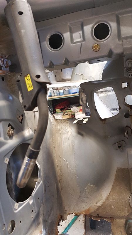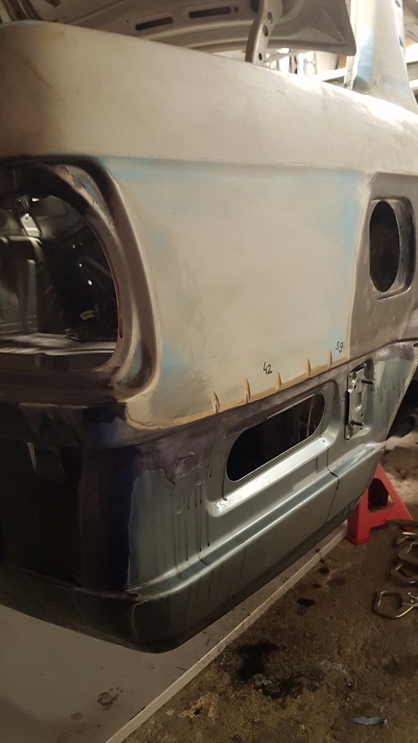 Üks vanemat sorti pilt ilma põlleta ja koos uute pagasniku põhja taladega. Lisaks on koha leidnud uus aku nurk . V8 swapiga seoses pean aku taha nurka tooma. Tagasilla sain ilusti alt kätte. Ennem uut tagasilda alla ei pane kui põhi korras pole. Pildil näha siis veel pagasniku põhja tala ja uus summuti klamber. Tagavararatta vanni küljes oleva summuti klambri vahetan välja, uus juba käes. Tagumise põlle sain ilusti paika keevitatud ja tuled läksid kenasti külge ning pagasniku vahed silmale ilusad. Vasak tagumine nurk sai kõik uued tükid, nii seest kui väljast. Hetkel ajan kaasreisija poolset tagumist nurka kokku. Parema poolega sama lugu, et kõik detailid uued või siis "uued" ja ilma roosteta. Vaikselt valmistan esiosa ette mootori vahetuse jaoks. Ninaraami ülemise osa teen polditavaks kuna siis on uut mootorit lihtsam vahele tõsta. Eelduste kohaselt peaks umbes 3-4 korda uut mootorit maha ja peale tõstma kuni lõpuks valmis kere vahele jõuab. Auto ostmise hetkel panin enda jaoks paika enam-vähem reaalse tähtaja, otsustasin et bemm peab valmis saama 5 aastaga - V8 mootoriga ja manuaal kastiga pühapäeva autoks. Tänaseks päevaks on möödunud umbes 2 aastat ja 1 kuu. Hetkel peaks mul olemas olema kõik vajalikud asjad liikuma saamiseks, keretöödeks ja mootori swapiks: kettaga tagumine sild, LSD, 51mm püstakud (2 komplekti), v8 mootor, 5k käigukast, ajud/juhtmed, kardaan, pidurivõim. 2 aastat ja 11 kuud veel minna.