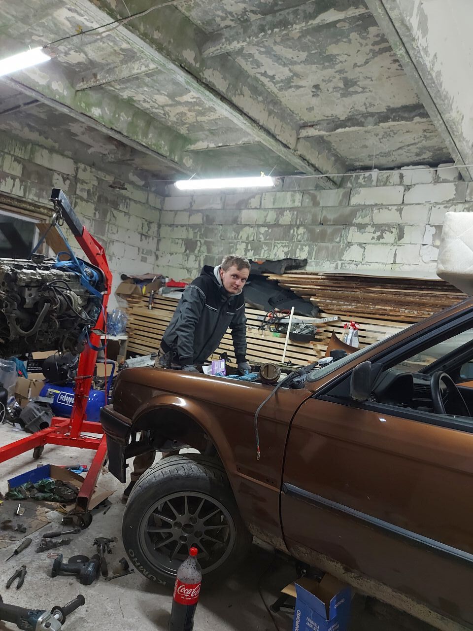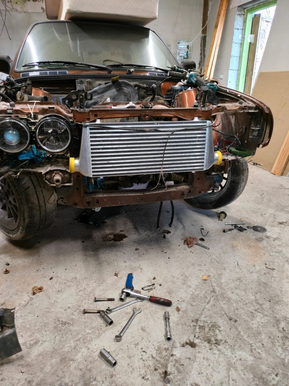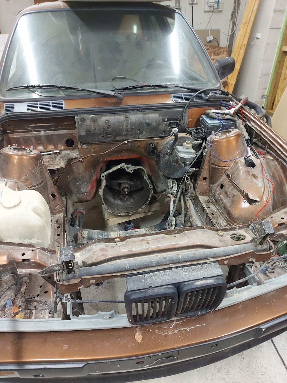 Sai üleliigne pudi nootori kyljest maha kruvitud ja karter ette võetud. 1/4 karterist eemaldatud ja ikka ei istu nii nagu peaks. Umbes 5 cm veel vaja mootorit allapoole saada. Sisselase ei taha ka originaal e30 pidurivõimuga mahtuda, tuleb kas kollet kärpida v kolida ümber e9x võimule. Siduri kompott tuleb ka kokku aretada